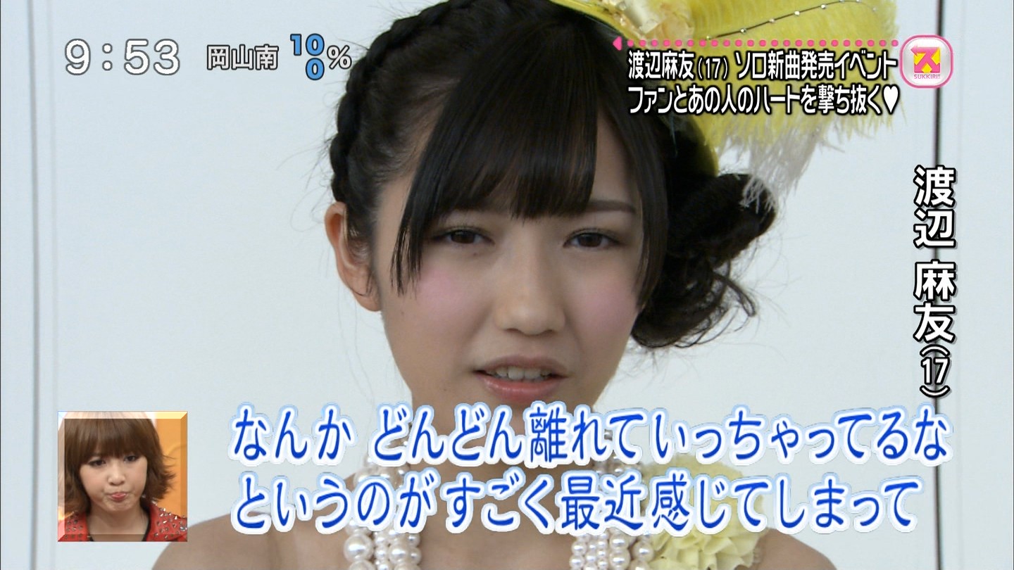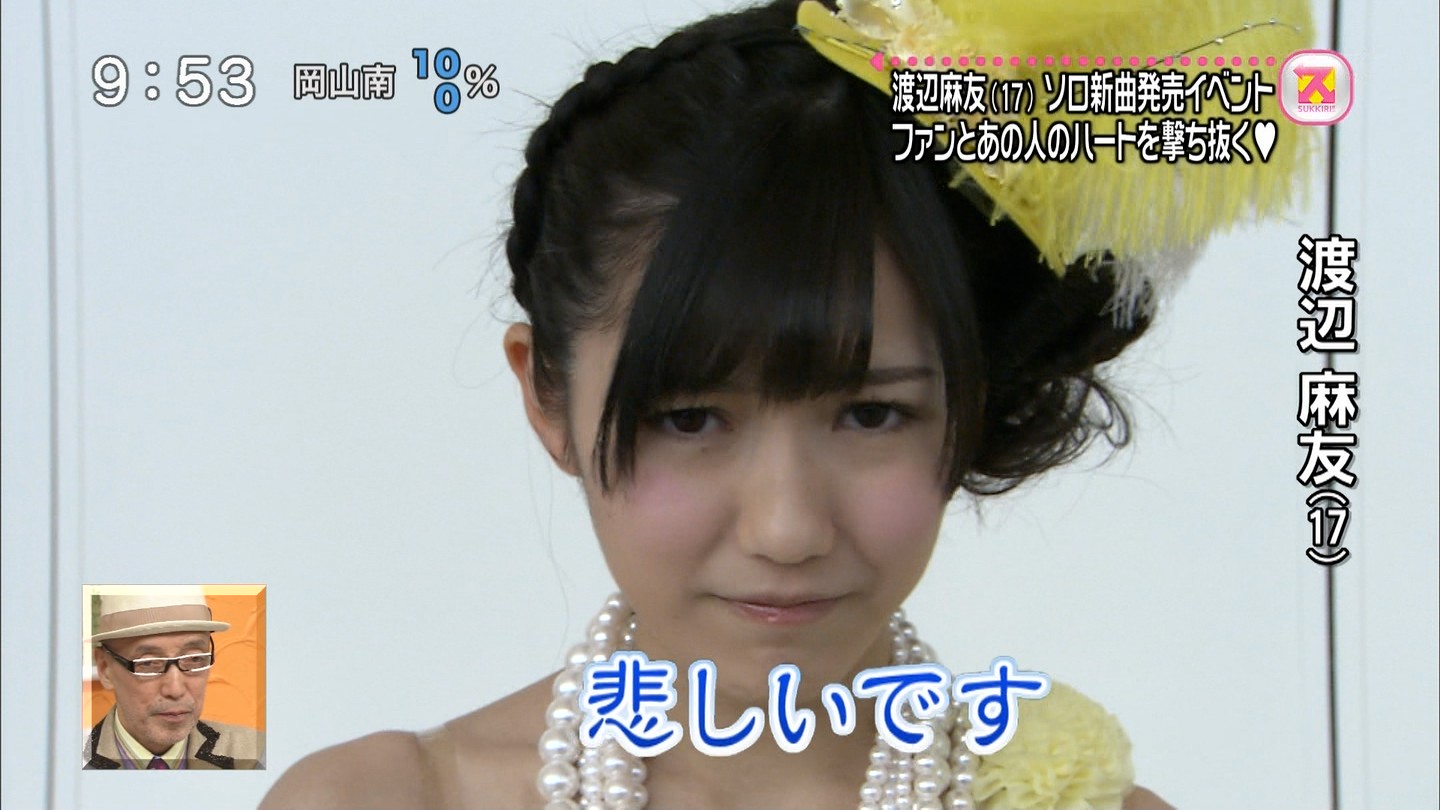 AKB48的渡辺麻友20日在東京稲城市出席個人出道單曲「シンクロときめき」的發售活動,她以劇集《欺詐偶像》38歲教師的裝扮登場讓觀眾驚訝,同時天氣放晴一洗雨女污名!她在現場唱出三首歌,5000名粉絲狂熱。26日將18歲生日的她收到驚喜蛋糕,同時抽選777人進行「心心射擊會」。